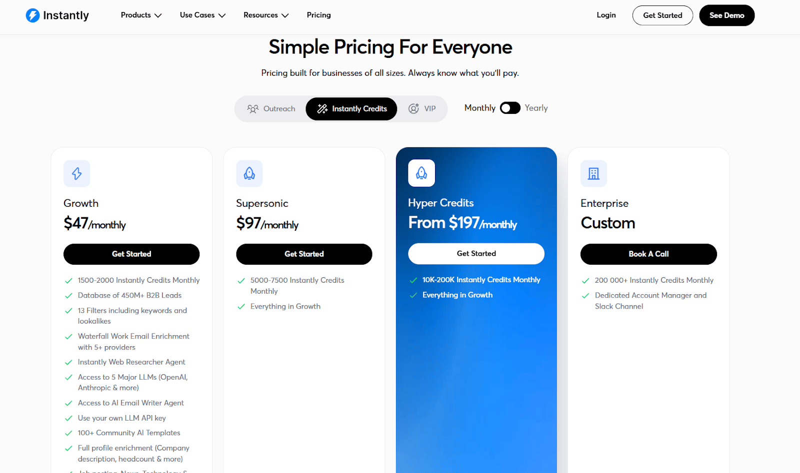 Instantly separates its “Credits” system from the core outreach plans. These credits power things like lead generation, enrichment, and AI-driven features. In other words, if you want the platform to actually find and qualify leads for you, you’ll need one of these plans too.