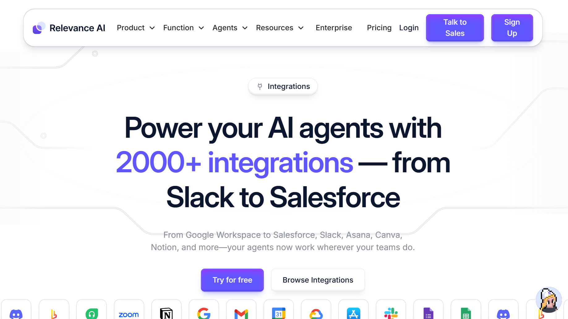 Relevance AI connects with over 2000+ range of tools like HubSpot, Salesforce, Gmail, Google Sheets, Slack, LinkedIn, and Zapier.