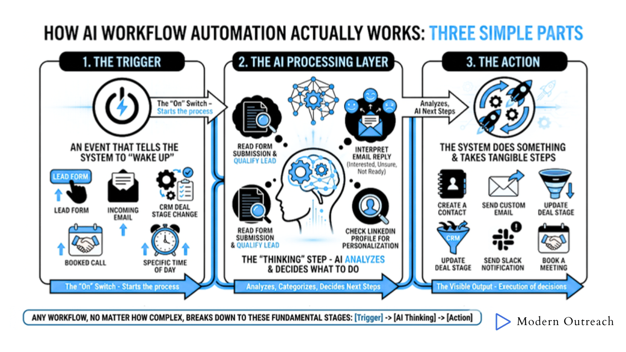 Every AI automation, no matter how complex it looks, really comes down to three simple parts. Once you understand these, you can look at any workflow and quickly figure out what’s going on.