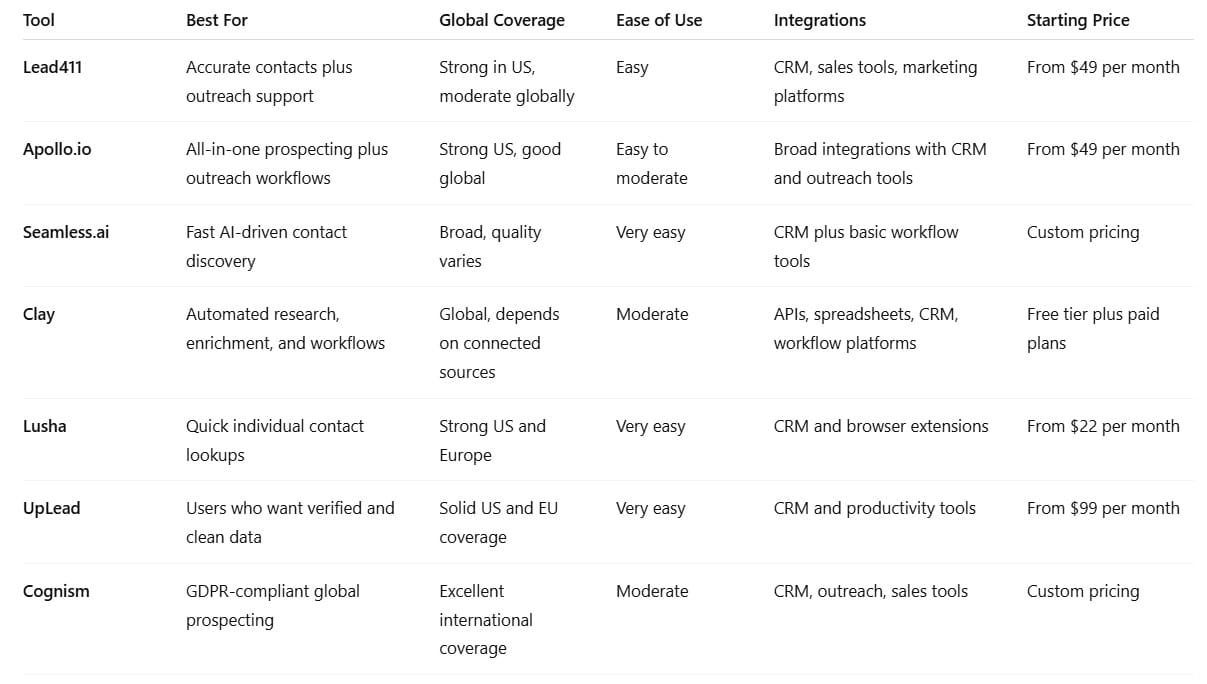 Platforms that prioritize strict verification, email validation, and frequent updates tend to lead in accuracy. If bounce rates, clean records, and manual verification matter most, pick a provider known for its data hygiene standards.
